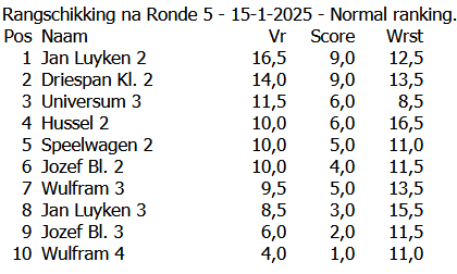 Dat er tussen de nummer 5 en 16 maar 3,5 bordpunt verschil zat gaf wel aan dat de schakers in de breedte erg aan elkaar waren gewaagd. Naast de top vier hebben de volgende twee teams zich ook geplaatst voor de finale: Kompas en Hussel 2 (beiden 11 punten). Deze finale wordt gehouden op woensdag 26 februari (locatie volgt nog).