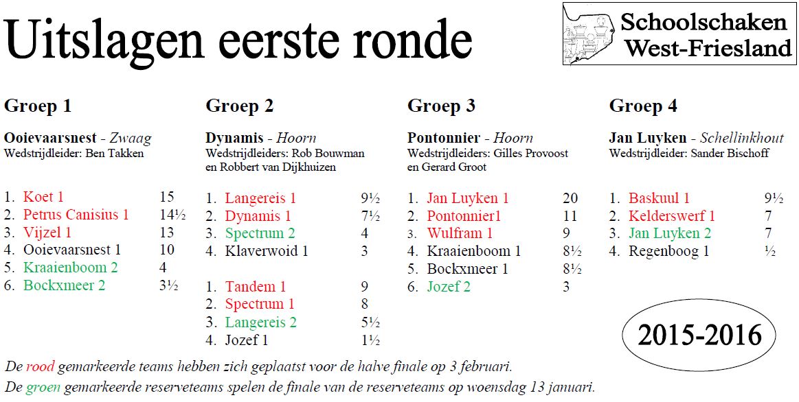 Afgelopen woensdag is het schaakkampioenschap voor basisscholen in West-Friesland weer van start gegaan. Op vier verschillende locaties werd gestreden om plekken in de halve finale, die in februari 2016 gespeeld gaat worden. Hieronder staan links naar de verkorte uitslag, de gedetailleerde uitslagen en foto’s.
